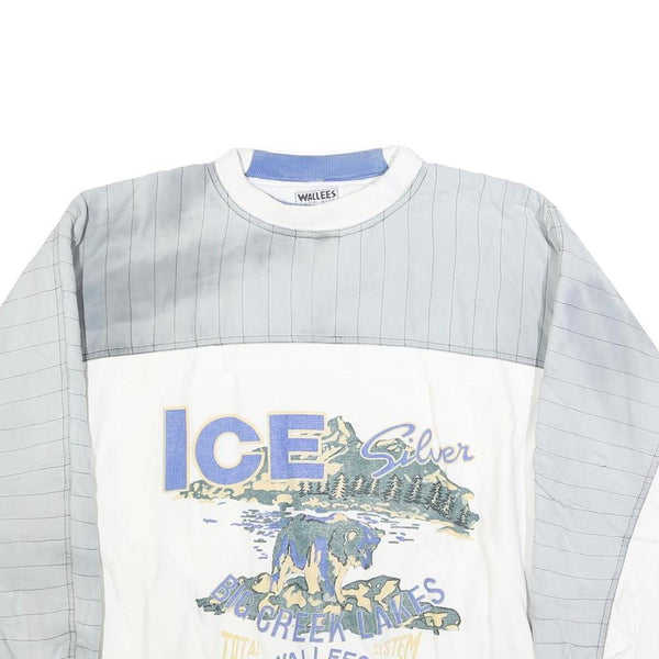 This WALLEES men's sweatshirt features a white body with grey panelled shoulders and sleeves, accented by fine pinstripes. The central graphic print reads "ICE Silver Big Creek Lakes WALLEES Total System," depicting a nature scene with a bear, enhancing its outdoor-inspired style.