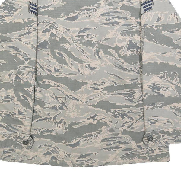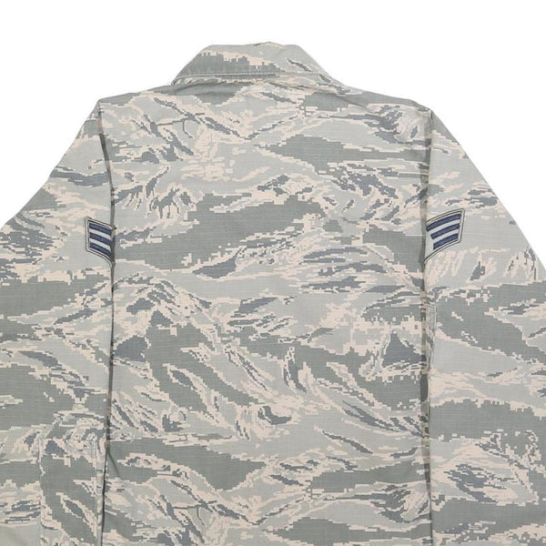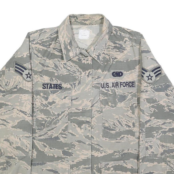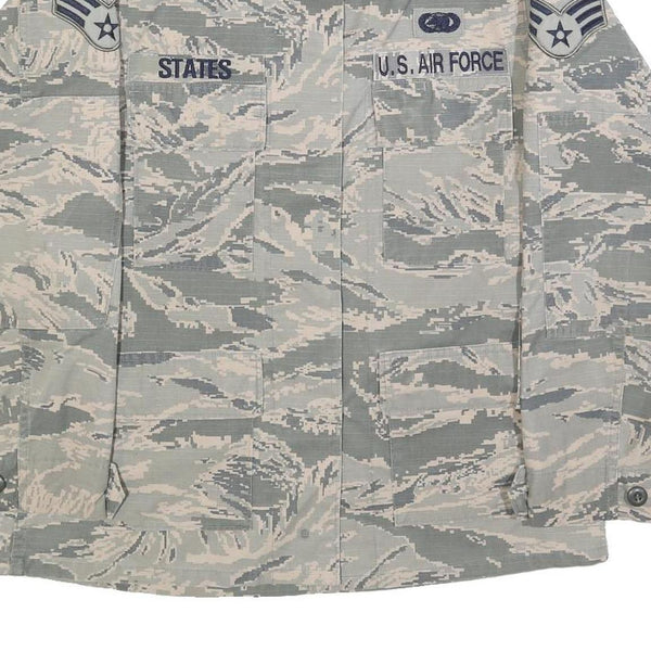 The fabric is a comfortable cotton blend, giving it breathability and durability, perfect for layering in transitional weather. Intended to evoke a military style, it displays detailed patches including U.S. Air Force insignia and rank chevrons on the sleeves and chest. This piece fits true to size and provides a regular cut for a comfortable everyday fit.