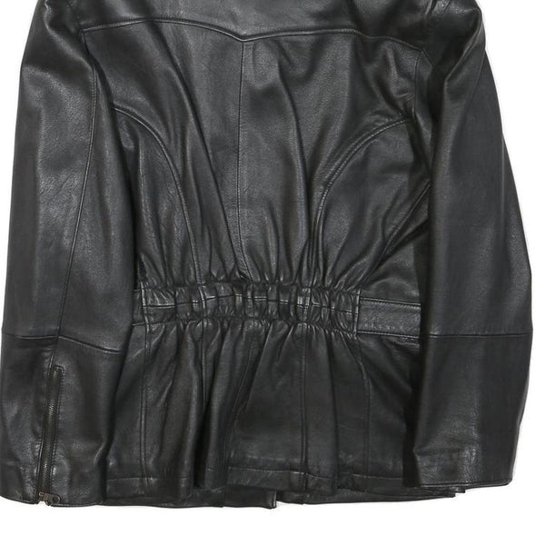 This jacket offers a flattering tailored fit that cinches at the waist with an integrated leather belt for added shape. The back features a gathered elasticated detail, enhancing the silhouette and comfort. The long sleeves include zipper vents at the cuffs for adjustable fit. Perfect for layering over casual or evening outfits, this timeless leather jacket pairs well with jeans, skirts, or dresses.