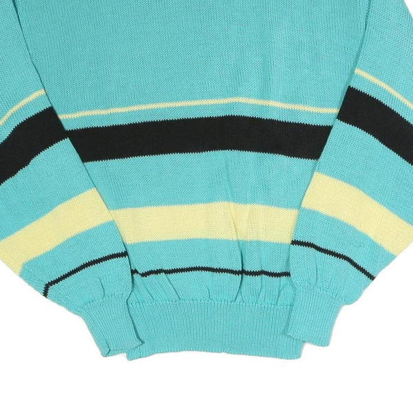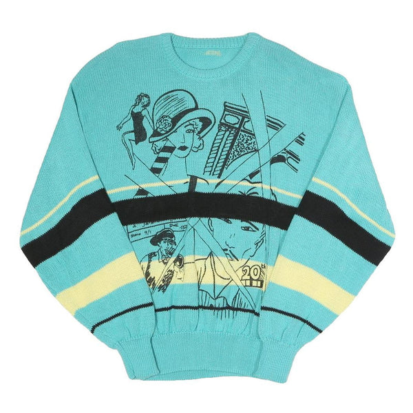 This womens jumper features a vibrant turquoise blue base with cream and black stripes around the chest and sleeves. The front of the jumper showcases a bold graphic print of vintage-style figures and architectural elements, adding a unique artistic flair to the garment. The pattern is playful yet stylish, sure to stand out in casual outfits.