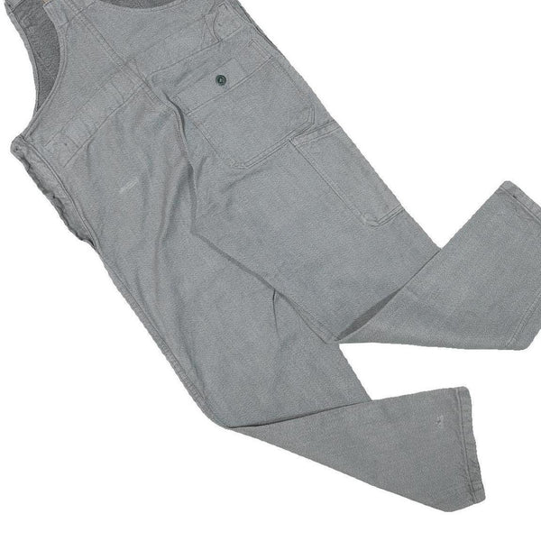 Designed with multiple pockets on the front including a zippered chest pocket for secure storage, these dungarees also have button closures on the side. The length corresponds to size XS W34 L28. The fabric is woven and robustly stitched at the seams, suitable for workwear or casual styling. The overall grey tone and minimalistic design give a timeless and versatile appeal.