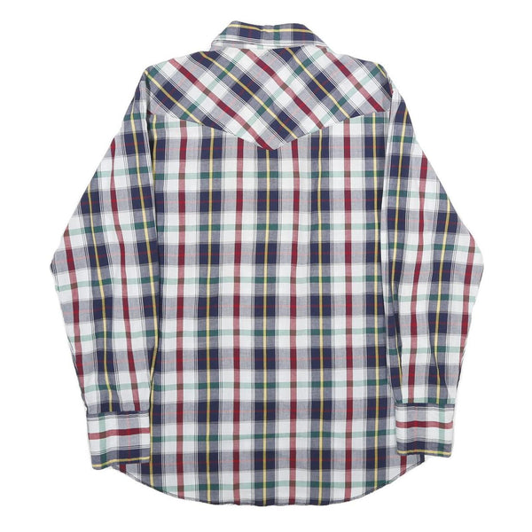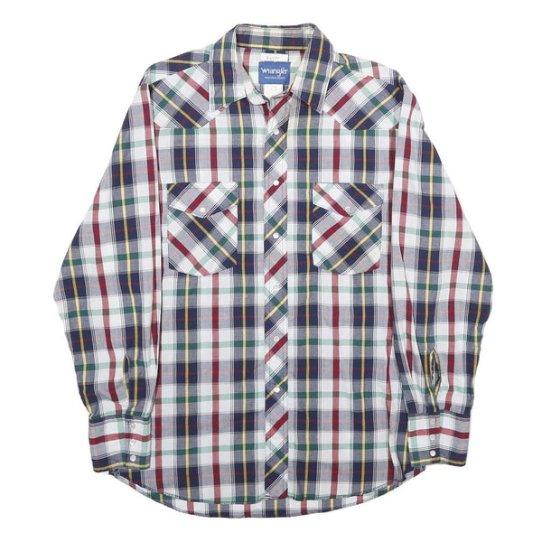This Wrangler mens shirt features a classic check pattern with navy blue, red, green, and yellow stripes on a white background. It has dual chest pockets with button closures and a pointed collar, accented with western-style yoke details on the front and back.