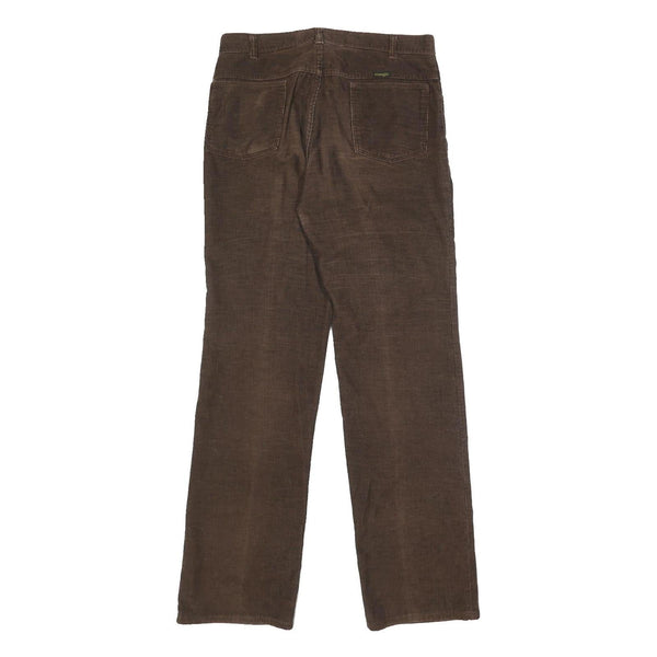 The trousers include a zip closure at the front for secure fastening and practical belt loops around the waist. Two front pockets and two back patch pockets provide convenient space for essentials. The back right pocket is subtly branded with the Wrangler logo stitched in green, adding understated authenticity. The simple plain pattern and rich brown colour make these trousers versatile and easy to pair with casual or smart-casual outfits.