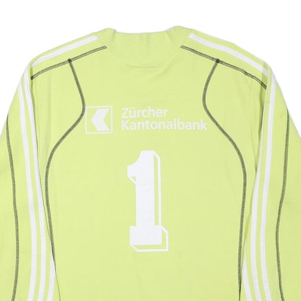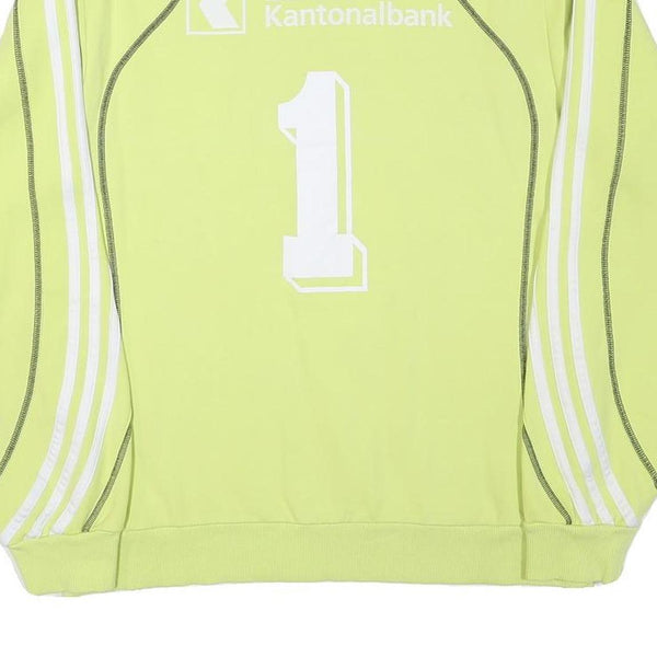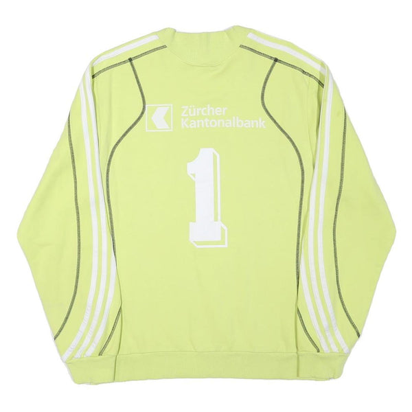 This Adidas mens sweatshirt features a vibrant green colour with contrasting white striped detailing along the sleeves and striking dark stitch accents that contour the body. The front displays the Adidas logo alongside a bold white '1' emblem, while the back includes a large '1' number and Zürcher Kantonalbank sponsor print, adding to its sporty aesthetic.