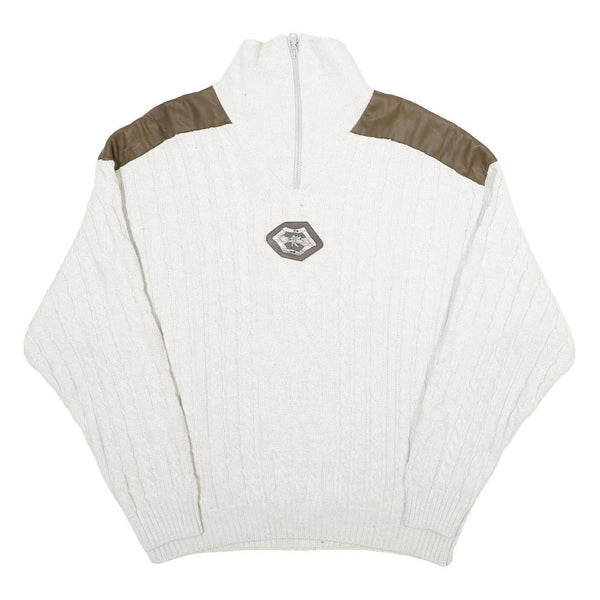 This Alpenland mens jumper features a predominantly white wool blend with brown shoulder panels made from a contrasting fabric. It has a distinctive cable knit pattern throughout and a high roll neck with a quarter zip for adjustable warmth and style. The chest bears a logo patch adding a unique branding feature to the front.