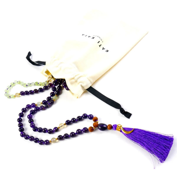 - Necklace: 108 beads of 8 mm with guru & large Grade A Amethyst Centre and recycled vegan tassel. Length: 43 cm drop, approximate as each piece of jewellery is unique.