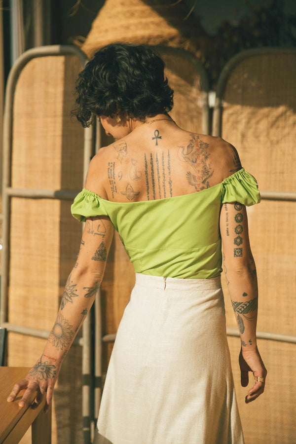 Cute green top with short puffed sleeves and gathered into a cute bow in front