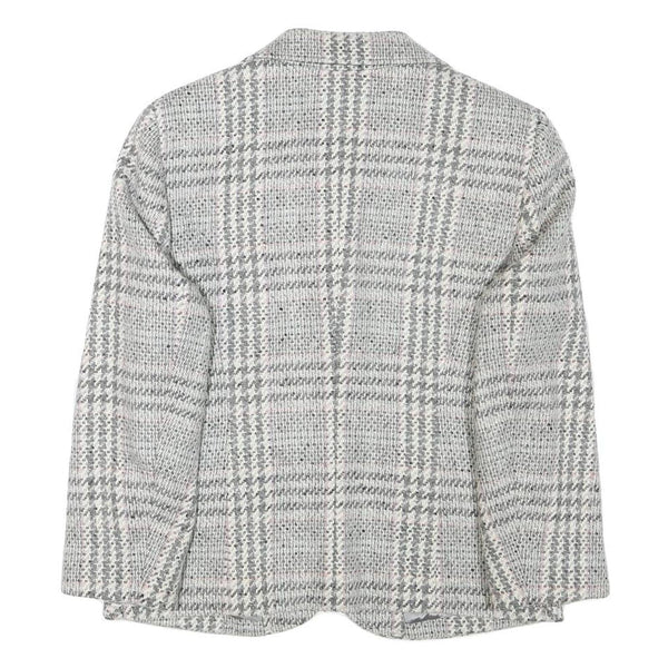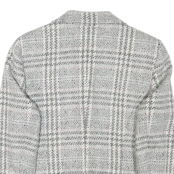The wool blend material offers warmth and a textured feel while maintaining a polished appearance. Perfect for smart casual or office wear, this jacket is versatile and stylish with its clean lines and timeless check pattern. The size S fits neatly for a petite frame, making it a smart addition to any wardrobe.