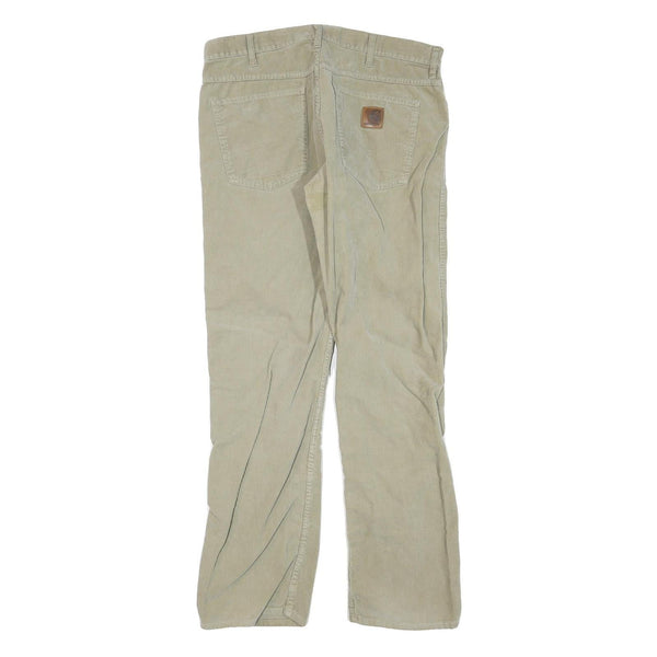 These men's Carhartt trousers come in a beige cotton blend fabric with a soft corduroy texture. The front features a classic zip closure and rivet detailing around the pockets, blending ruggedness with everyday wearability.