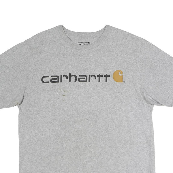 This Carhartt mens t-shirt is crafted from a soft cotton blend in a classic grey shade. The front features the brand's distinctive logo prominently printed across the chest in black and yellow, adding bold branding to a clean design. The crew neckline and short sleeves offer a comfortable and classic fit suitable for everyday wear.