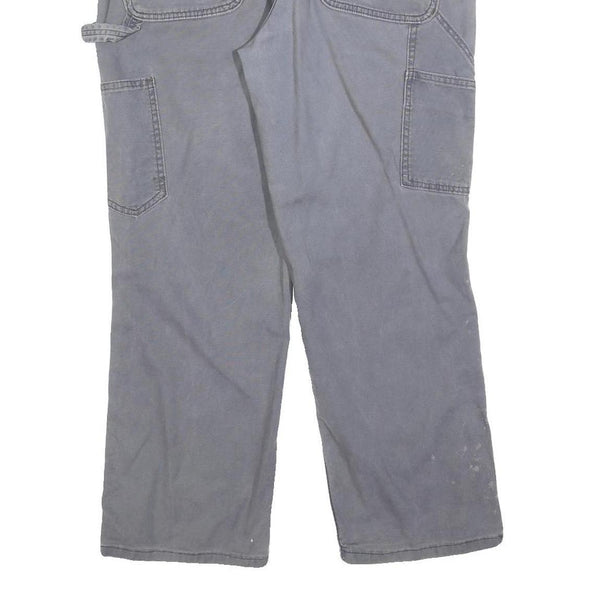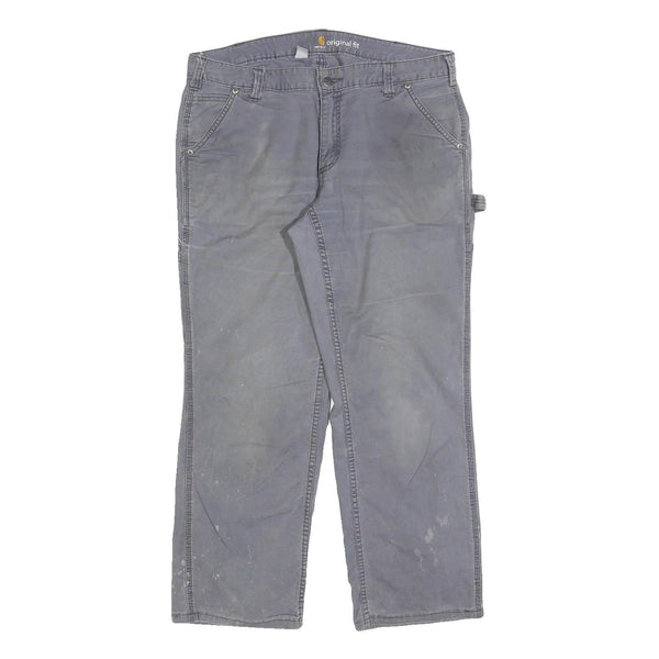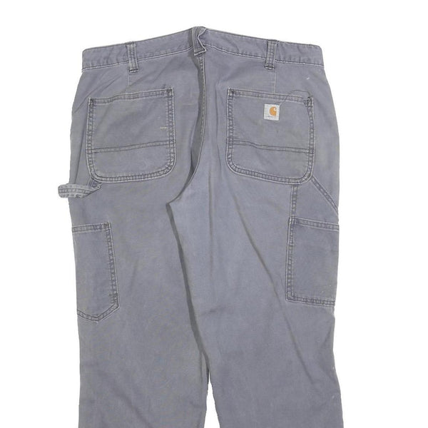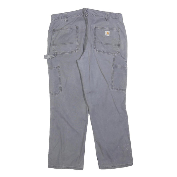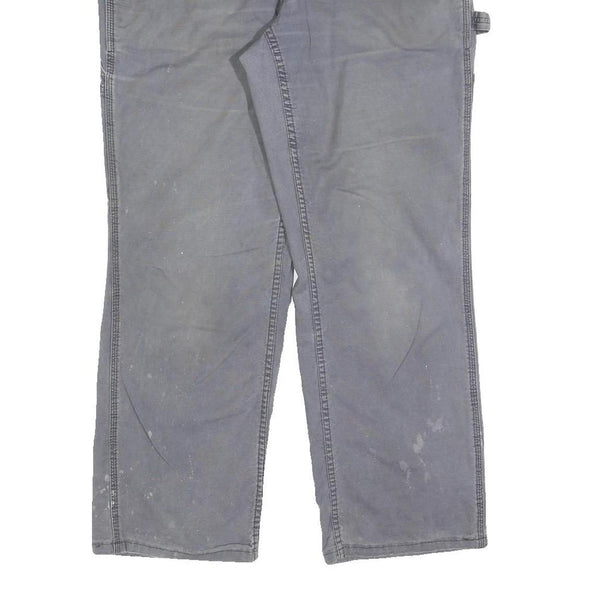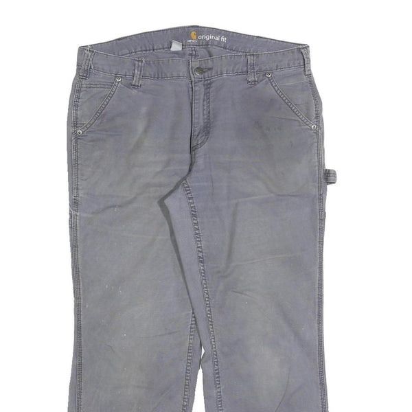 These womens CARHARTT trousers are made from a durable cotton blend material, offering a comfortable and robust fit. They have a relaxed fit with a straight leg cut, designed for ease of movement and everyday wear. The fabric is in a grey colour with slight signs of wear and some visible stains typical for work clothing.