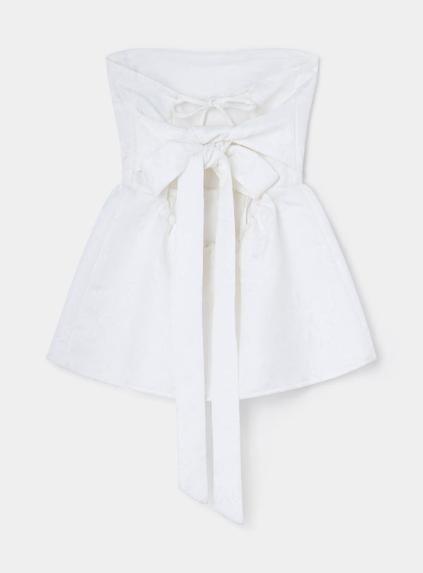 Strapless black top. Jacquard texture. Pleated detail on the waist, adjustable back straps, and front or back bow