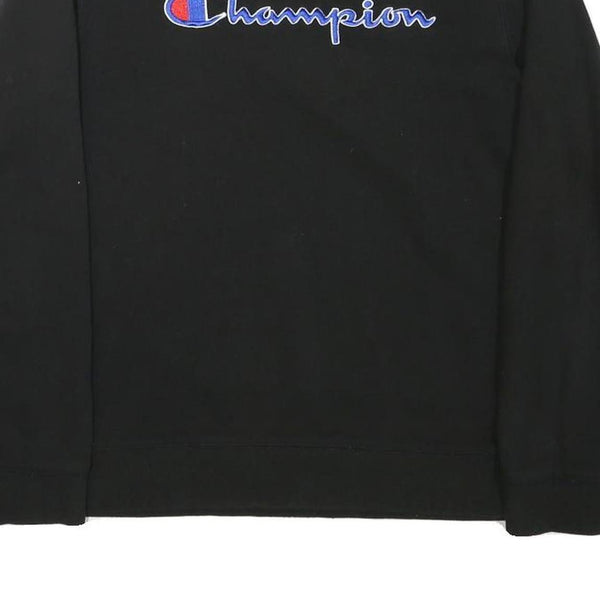 This Boys Champion sweatshirt features a solid black colour with the iconic Champion logo embroidered prominently across the chest in blue and red. The ribbed crew neck, cuffs, and hem offer a classic sweatshirt silhouette perfect for casual wear.