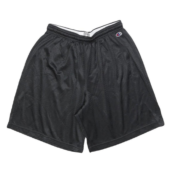 These mens shorts by Champion are in black, made of breathable polyester mesh fabric that offers a lightweight and comfortable feel. They feature an elastic waistband for a snug fit and the small Champion logo embroidered on the front left hip adds subtle brand detail.
