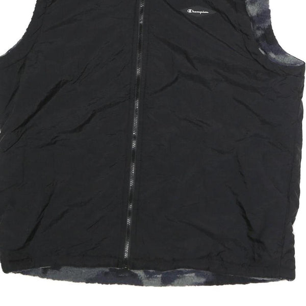 This Champion mens jacket comes in solid black on the outer side with a subtle embroidered Champion logo on the chest. The jacket features a full zip closure and a stand-up collar for a sleek, sporty look. It is sleeveless, making it an ideal layering piece.