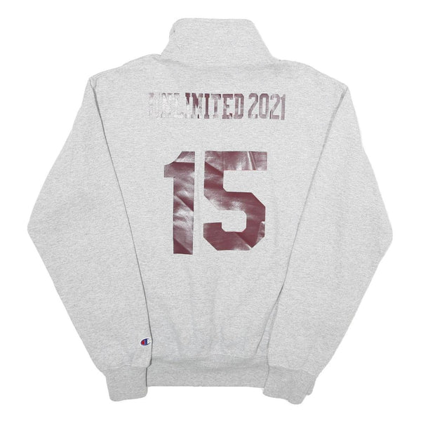 This Champion mens sweatshirt is a light grey 1/4 zip pullover featuring maroon lettering on the front saying "BOBCATS" and a graphic of a foot. On the back, "UNLIMITED 2021" is printed at the top with a large number "15" below, both in the same maroon colour.