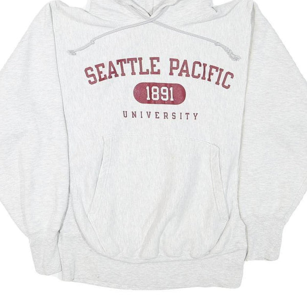 This Champion hoodie is made from a soft cotton blend fabric in a light grey colour. It features a large printed graphic on the front in maroon red text stating "Seattle Pacific 1891 University," giving it a collegiate look. The hoodie has a classic pullover style with a hood and drawstring for adjustable coverage.