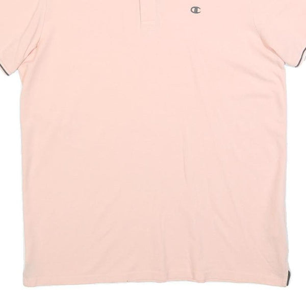 This men's polo shirt from Champion is a soft pastel pink shade, detailed with subtle grey and white trim on the collar and sleeve cuffs. The front chest proudly displays the classic Champion 'C' logo embroidery in grey. It features a traditional polo collar with a two-button placket for adjustable comfort and style.