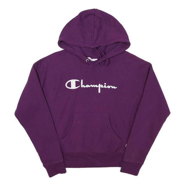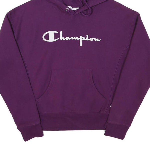 This mens hoodie from Champion presents in a rich purple shade with a bold white "Champion" scripted logo across the chest. The front features a classic kangaroo pouch pocket and a drawstring hood for adjustable coverage. The fabric is a soft cotton blend, providing comfort and warmth with a smooth finish.