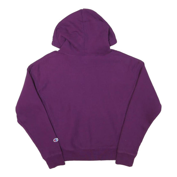 Designed as a pullover style, the hoodie offers a regular fit and long sleeves with ribbed cuffs and hem for a secure and cosy wear. A small Champion logo patch is stitched near the cuff on the sleeve, adding an authentic branded touch. The back is plain purple for a clean, simple look.