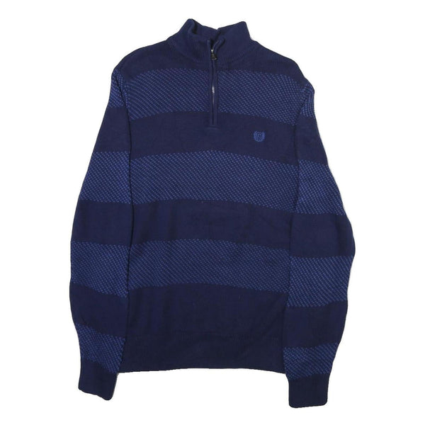 This CHAPS mens jumper features broad horizontal stripes in navy and a lighter blue patterned knit, blending classic and contemporary style. The half-zip high neck adds versatile warmth and a smart finish, with a subtle embroidered 'C' logo on the chest enhancing the branding.