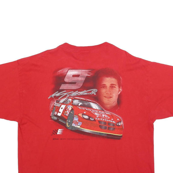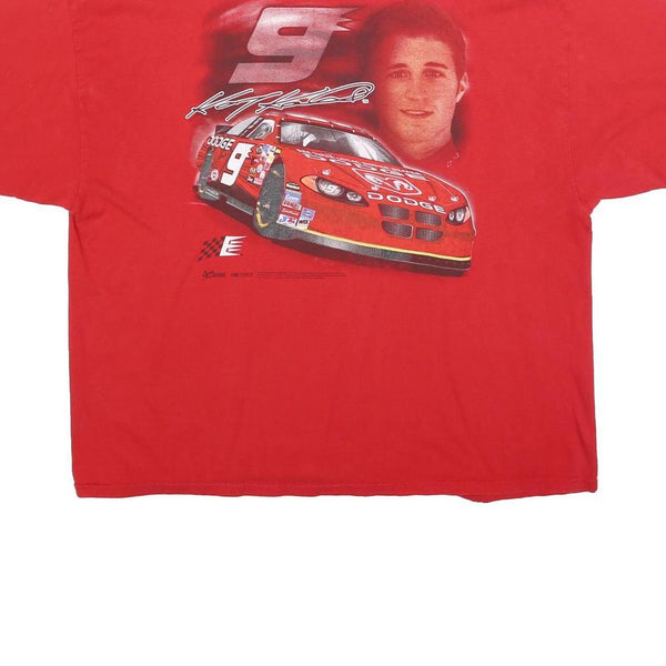 This Chase Authentics mens T-shirt comes in a bright red shade featuring a striking racing-themed graphic print. The front displays a large silver number 9 set inside an oval, accompanied by a signature style script. The back of the shirt showcases a larger, detailed graphic of a red Dodge racecar alongside the same number 9 and a photographic portrait of a young male driver.