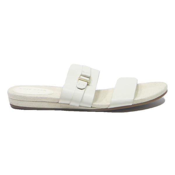 These COLE HAAN womens sandals feature a clean white leather upper with two straps, one adorned with a sleek gold-tone buckle. The sandal offers a slip-on slider design perfect for easy wear.