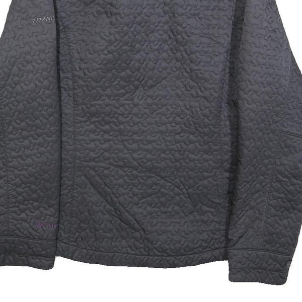 This womens Columbia jacket features a deep black colour with an all-over quilted texture adding subtle depth to its design. The front showcases a full zip closure and side pockets, while the collar has a soft fleece lining for added comfort. Small embroidered branding details appear on the lower sleeve and cuff, including the word "Titanium" on the upper arm, highlighting the premium line.
