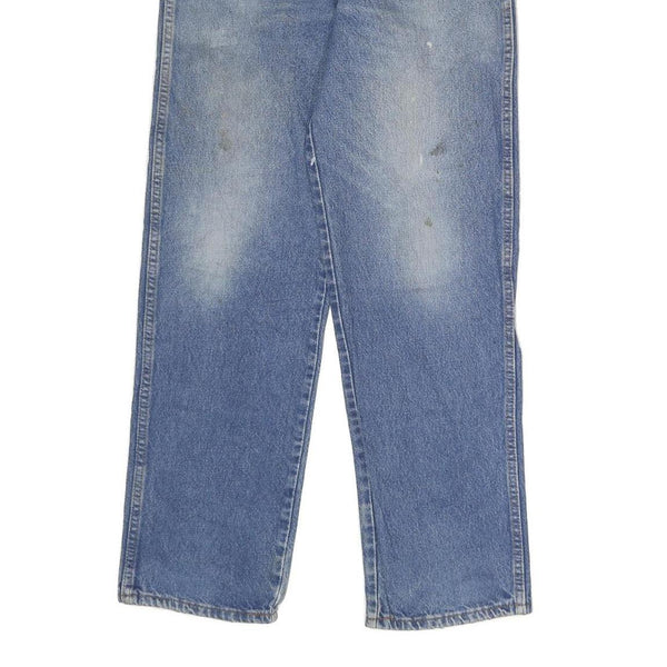 The back has two patch pockets, one adorned with a small red and yellow Dickies logo patch. The jeans have some visible wear and typical signs of previous use including light soiling and faint marks, consistent with fair pre-loved condition. These versatile jeans offer both comfort and lasting style for casual everyday wear.