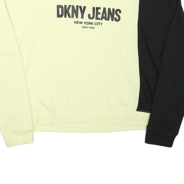 This DKNY Womens sweatshirt features a striking colourblock design with a cream body and contrasting black left sleeve. On the front, bold black text reads "DKNY JEANS NEW YORK CITY CIRCA 1989", providing a stylish branded graphic detail. The sweatshirt has a classic crew neck and long sleeves with ribbed cuffs and hem.