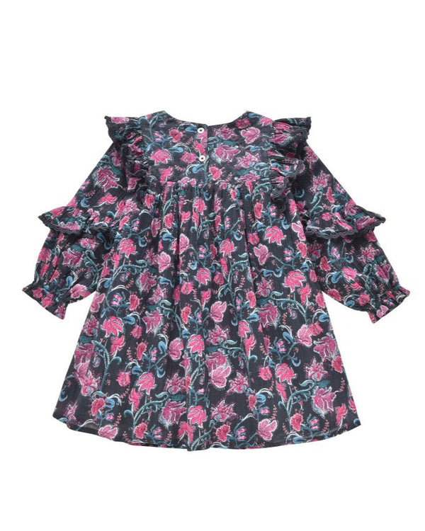 We are in love with this dress! Organic cotton girl's dress Lara ( back in new spin) is flowy, breathable, lightweight, and with stunning delicate details. Lara dress has a round neck, padded breastplate, and upper back with lace finished ruffle at the shoulders and elbows, comes with elastic cuffs with a flounce and has side pockets with lace. Lara dress is knee length and entirely linen and cotton is from organic farming. The stunning Lara dress is made with organic cotton in a charcoal wildflowers print by Louise Misha.