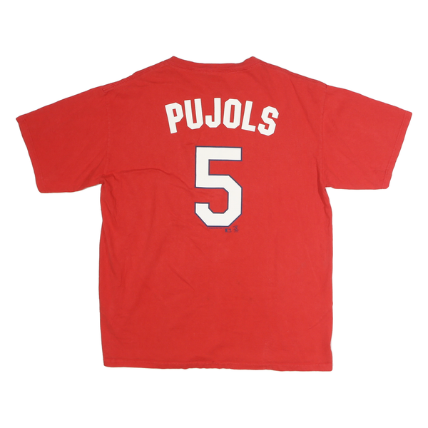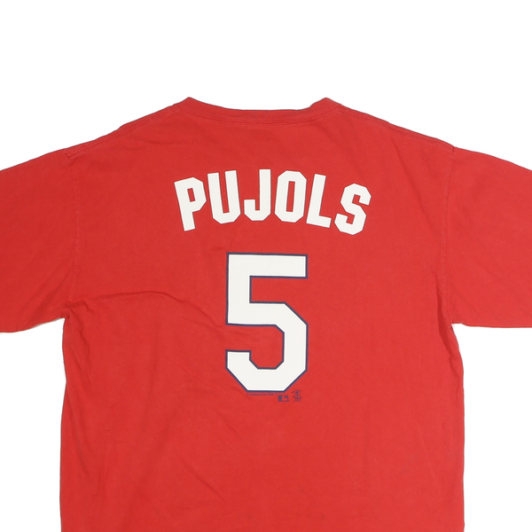 This Genuine Merchandise Cardinals T-shirt features a vivid red cotton fabric with a large front graphic print of the word "Cardinals" alongside a cardinal bird perched on a baseball bat and the number 5. The back displays the name "PUJOLS" with the number 5 below it, both in white block lettering.
