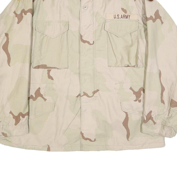 This mens jacket from Golden Mfg Co. Inc. features a beige base with brown camouflage accents in a military-inspired design. The front displays four spacious flap pockets and a "U.S. Army" embroidered patch on the chest. An American flag patch adorns the left arm, adding to the authentic military style.