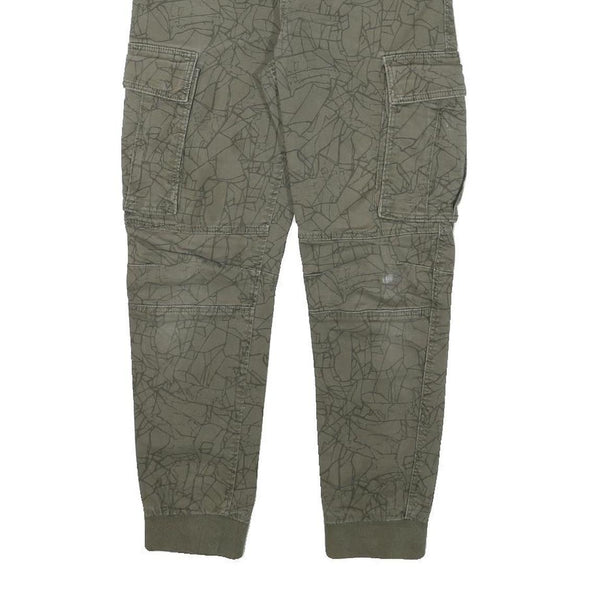 These womens trousers by H&M feature a relaxed fit with an olive green base colour topped with a subtle cracked abstract print throughout. They have a drawstring waistband for adjustable comfort and ribbed cuffs at the ankles for a snug fit. The trousers are styled with large flap cargo pockets on the legs adding a functional and casual element.