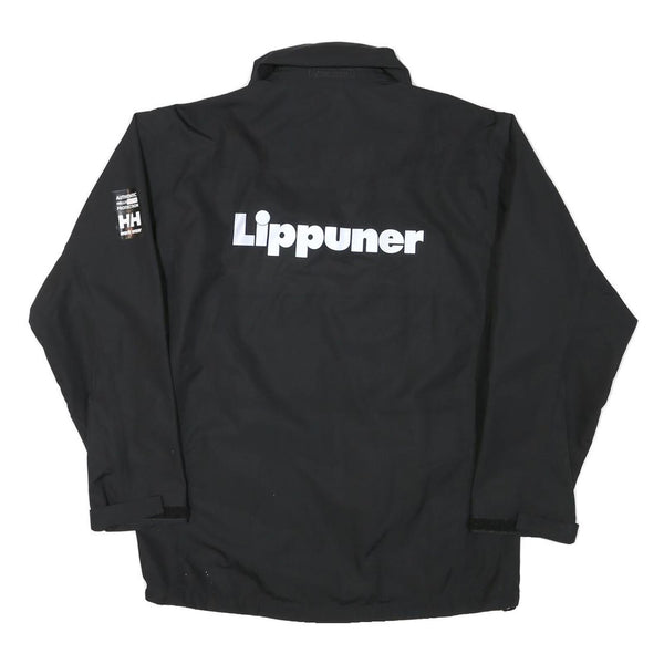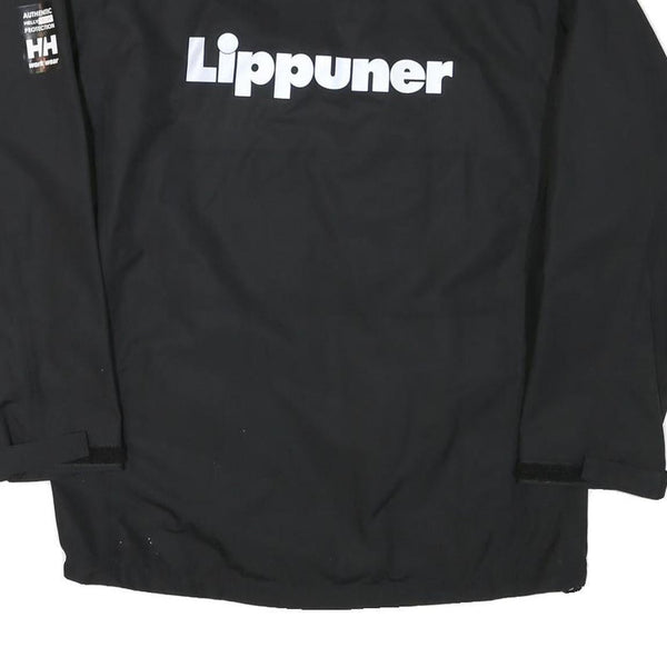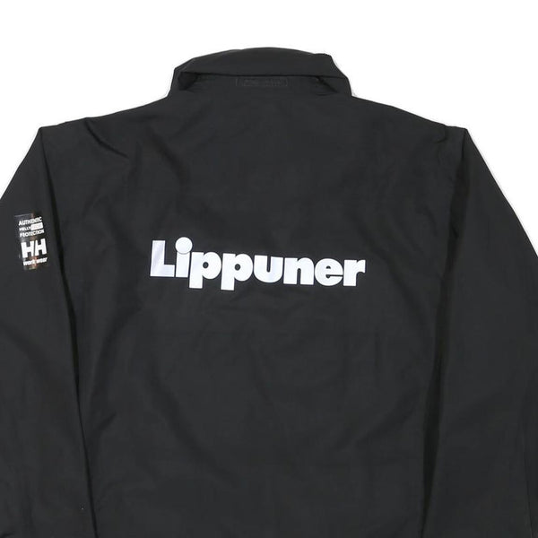 This Helly Hansen mens jacket features a sleek black colour with bold white "Lippuner" branding prominently displayed on the back. The front has a subtle HH workwear logo on the chest and sleeve patches, adding authentic brand detailing. It has a stand-up collar and a central zip closure with a covered storm flap for protection against the elements.