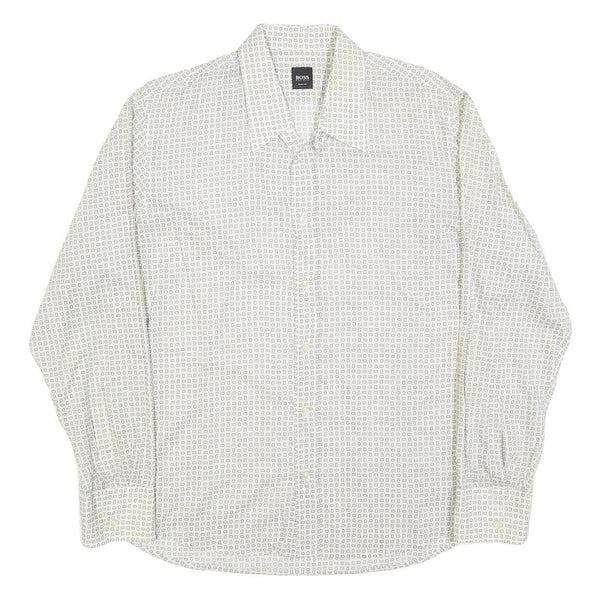 HUGO BOSS Mens White & Grey Patterned Shirt XL Lightweight Polyester Blend Smart