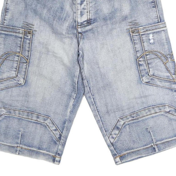 These IDPDT Mens shorts feature a soft blue washed denim look with slight distressing on the front and rear pockets, showcasing a relaxed and casual style. The shorts have multiple pockets, including large cargo side pockets with decorative stitching, adding both utility and visual interest. The button and zip closure secure a comfortable fit at the waist.
