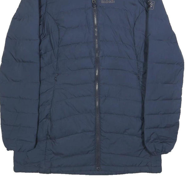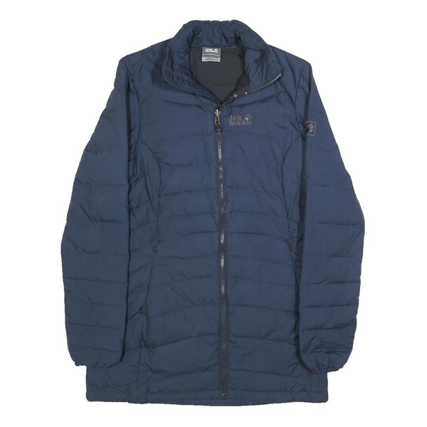 This womens Jack Wolfskin jacket is a deep navy blue with the Jack Wolfskin logo embroidered on the left chest and a branded patch on the upper sleeve. The jacket features a full front zip closure and side zip pockets, offering secure storage. The fabric has a slight sheen and the jacket is quilted in horizontal sections for insulation and style.