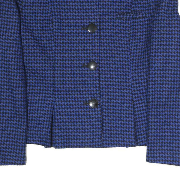 This womens jacket showcases a distinctive blue and black houndstooth pattern with black buttons running down the front. It features a band collar and long sleeves with buttoned cuffs for a refined look.