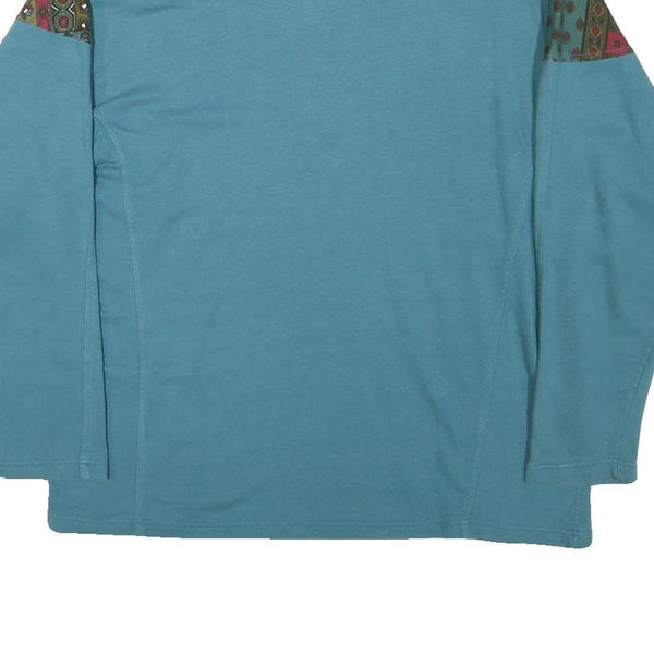 This womens sweatshirt by Just U features a soft blue cotton blend fabric with unique embroidered central graphic displaying a stylised geometric motif and text reading "Byzantine Authentic Just U Co.". Additional patch details with patterned fabric and decorative studs adorn the upper sleeves for a vintage-inspired look. The top has a half-zip crew neck collar and long sleeves offering a relaxed fit comfortably suited for casual wear.