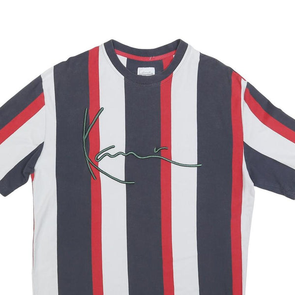 This KARL KANI mens t-shirt features bold vertical stripes in blue, white, and red for a striking, stylish look. The front showcases an embroidered green signature-style graphic logo that adds a distinctive branded touch. It has short sleeves and a classic crew neckline for timeless appeal.