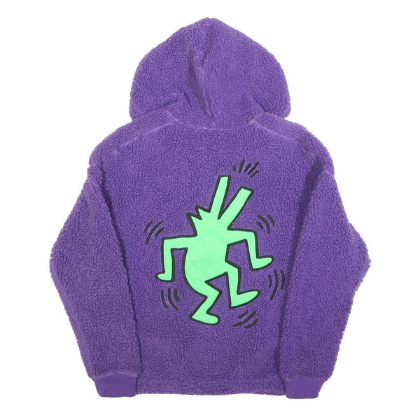 This womens Keith Haring hoodie features a vibrant purple fleece fabric that is soft and plush to the touch, providing warmth and comfort. The front includes a quarter zip closure with a contrasting green zipper pull and a small embroidered graphic patch inspired by Keith Haring's iconic artistic style. The hood is adorned with a black embroidered signature.