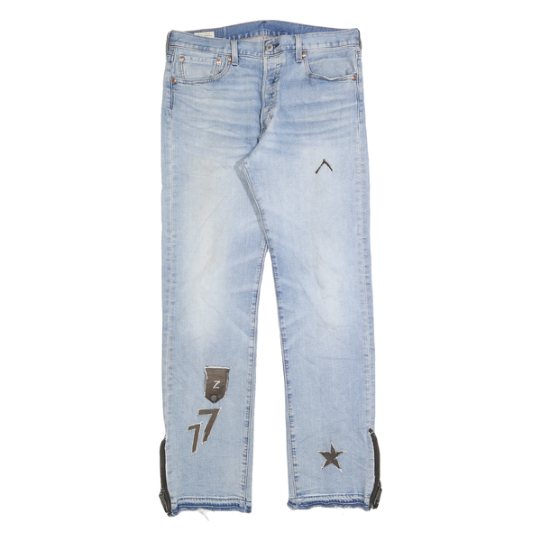 These LEVI'S 501 Big E mens jeans feature a light blue denim colour with distinct vintage-inspired patches including stars, chevrons, and crossed motifs on the front and lower legs. The jeans have a classic regular fit with straight legs, highlighted by zippered cuffs and a slightly frayed hem for an edgy look.