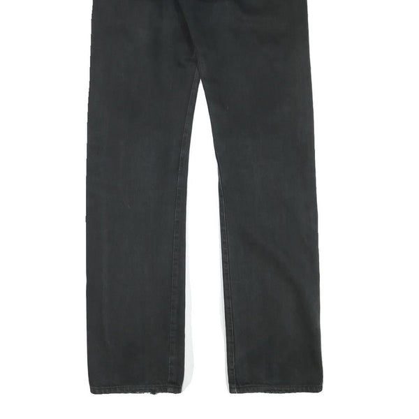 These LEVI'S 501 Mens Jeans are crafted from a durable cotton blend denim in a solid black colour. They feature the classic straight leg design associated with the 501 model and have a button fly closure. The jeans display subtle fading in areas typical of pre-loved items, contributing to an authentic vintage feel.
