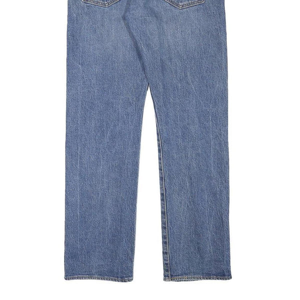 Constructed from a cotton blend, these jeans offer sturdy comfort with a timeless look. The medium wash denim has subtle fading around the knees and thighs, adding a worn-in aesthetic typical of authentic Levi's styling. The rear leather label patch is visible above the back pockets, confirming their genuine origin.