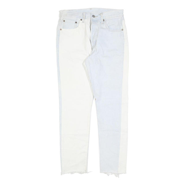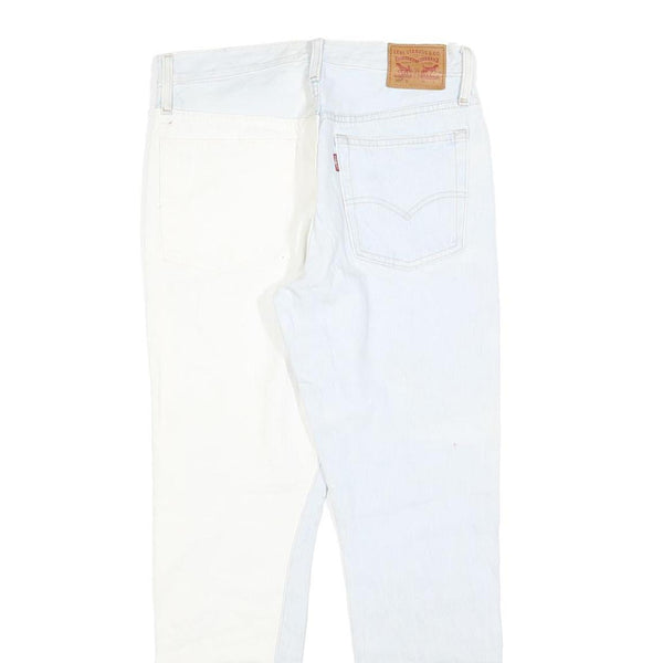 These LEVI'S 501S womens jeans feature a distinctive dual-colour design combining blue and white denim panels. The skinny cut offers a sleek slim fit with a raw hem finish adding an edgy touch to the classic design. Prominent copper rivets and traditional five-pocket styling enhance the authentic Levi's look.