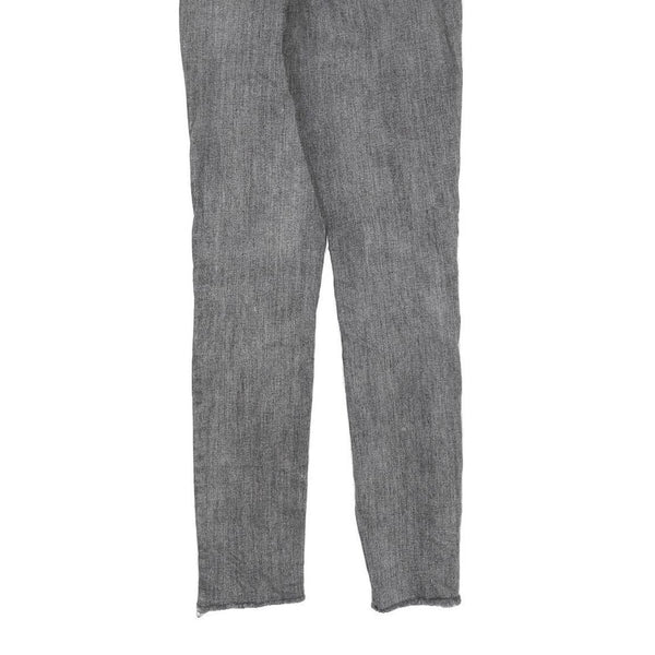 These LEVI'S 711 BIG E womens jeans showcase a light grey denim with a subtle distressed patch on the right knee and frayed hems for a stylish worn-in effect. The slim fit hugs the legs, tapering down to a skinny silhouette, accentuating shape and providing a modern edge.