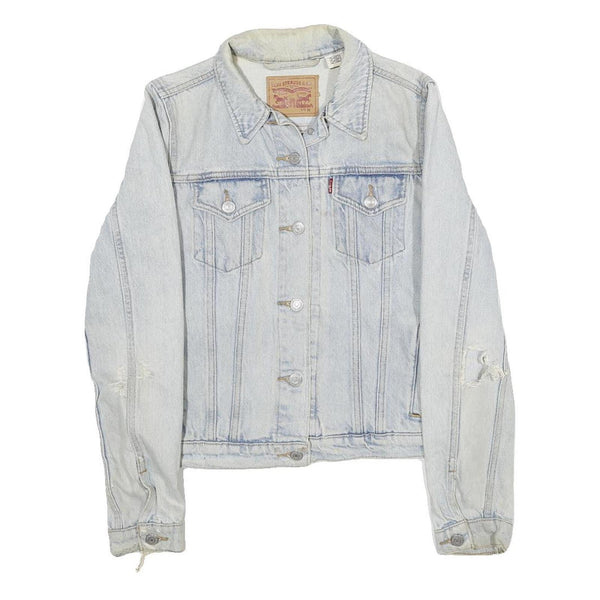 There are visible distressed details on the sleeves and minor wear marks consistent with pre-loved condition, adding character to the jacket. The collar is a classic pointed style, and the buttoned cuffs achieve a traditional denim jacket look. Levi's is renowned for its durable denim products and vintage-inspired designs, making this jacket a stylish and versatile outerwear option.