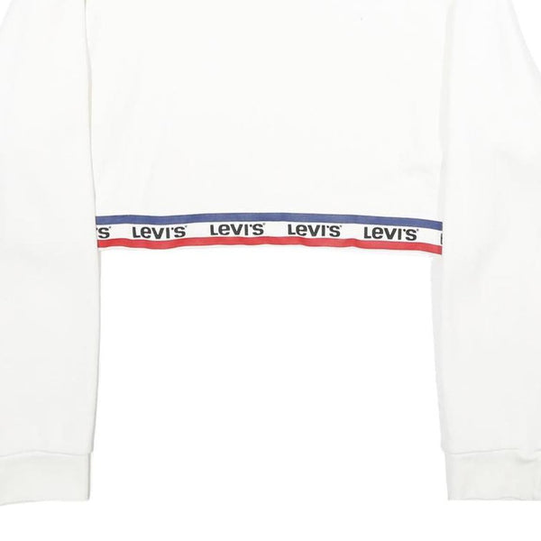 This Levi's womens sweatshirt is crafted from a soft cotton blend material in a crisp white shade. It features a crew neck and long sleeves, delivering a classic, comfortable fit suitable for casual wear. Around the bottom hem, a distinctive navy and red band displays repeated Levi's branding for a sporty, branded look.