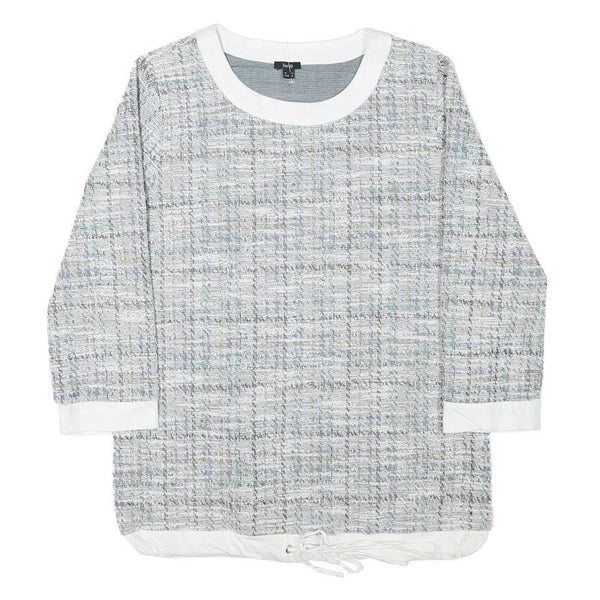 This Livie womens top features a subtle grey and white pattern woven into a textured fabric, giving it a chic and elegant look. The top has white ribbed trims on the round neckline, cuffs, and hem, adding a clean contrast to the overall design. It is designed with long sleeves and a relaxed fit that offers comfort and ease of movement.
